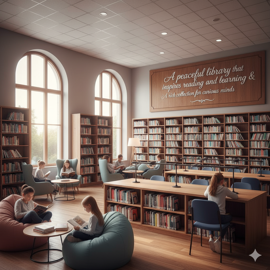 A peaceful library that inspires reading and learning & A rich collection of books for curious minds.